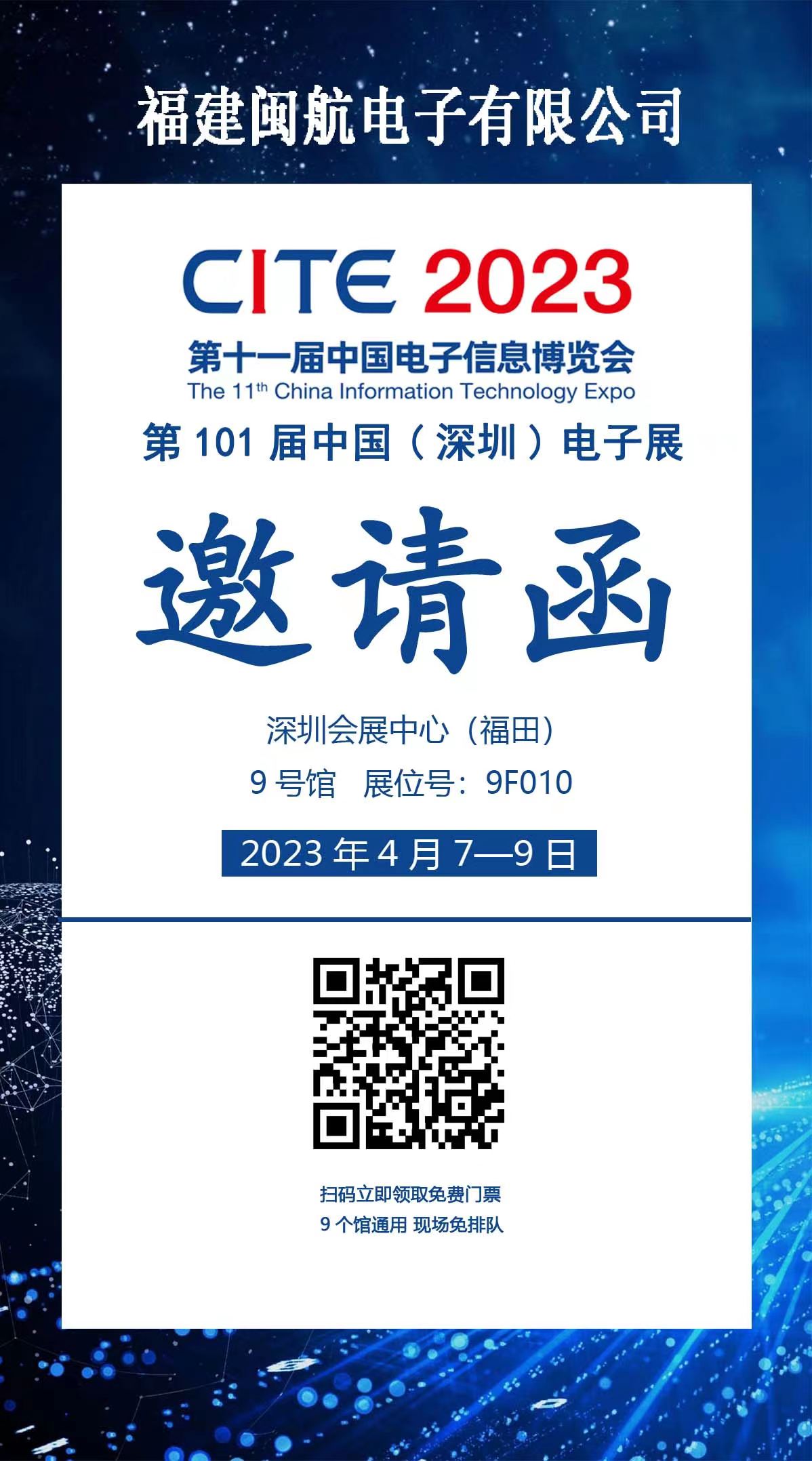 【概要描述】2023深圳電子展4月7-9日(周五-周日)在深圳福田會(huì)展中心開展,開展倒計(jì)時(shí)中,我們福建閩航電子有限公司在9號(hào)館,展位號(hào)是:9F010,誠摯邀請(qǐng)您前來觀展,提前掃碼申請(qǐng)免費(fèi)門票,現(xiàn)場免排隊(duì),期待您的到來...